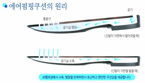 보행과정에서 지면을 밟을 때 신발 바닥창 공기실의 공기가 압착되어 신발 내부로 밀려들어가고, 발을 들어 신발이 공중으로 들릴 때에는 압착되었던 신발창 공기실이 원상으로 복원되면서, 신발 뒤쪽에 구비한 공기 흡입구로 외부의 신선한 공기를 끌어들이게 되는 과정을 보행 시 반복하게 되어 외부 공기를 신발내부로 지속적으로 순환시킴은 물론 신발바닥창의 반복적 수축·복원에 따른 에어펌핑쿠션 작용으로 포근하고 편안한 쿠션감을 제공합니다.