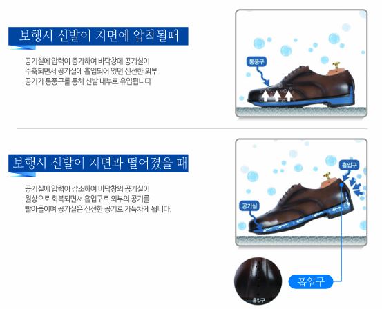 신발 바닥창에 공기실과 공기순환통로를 설치하고, 에어패스기술을 적용하여, 보행 시 신발 바닥창 공기실에 에어펌핑 작용을 유도함으로써, 외부의 신선한 공기를 신발내부로 흡입·순환되게 하는 통풍기능과 포근한 에어쿠션기능을 동시에 제공합니다.