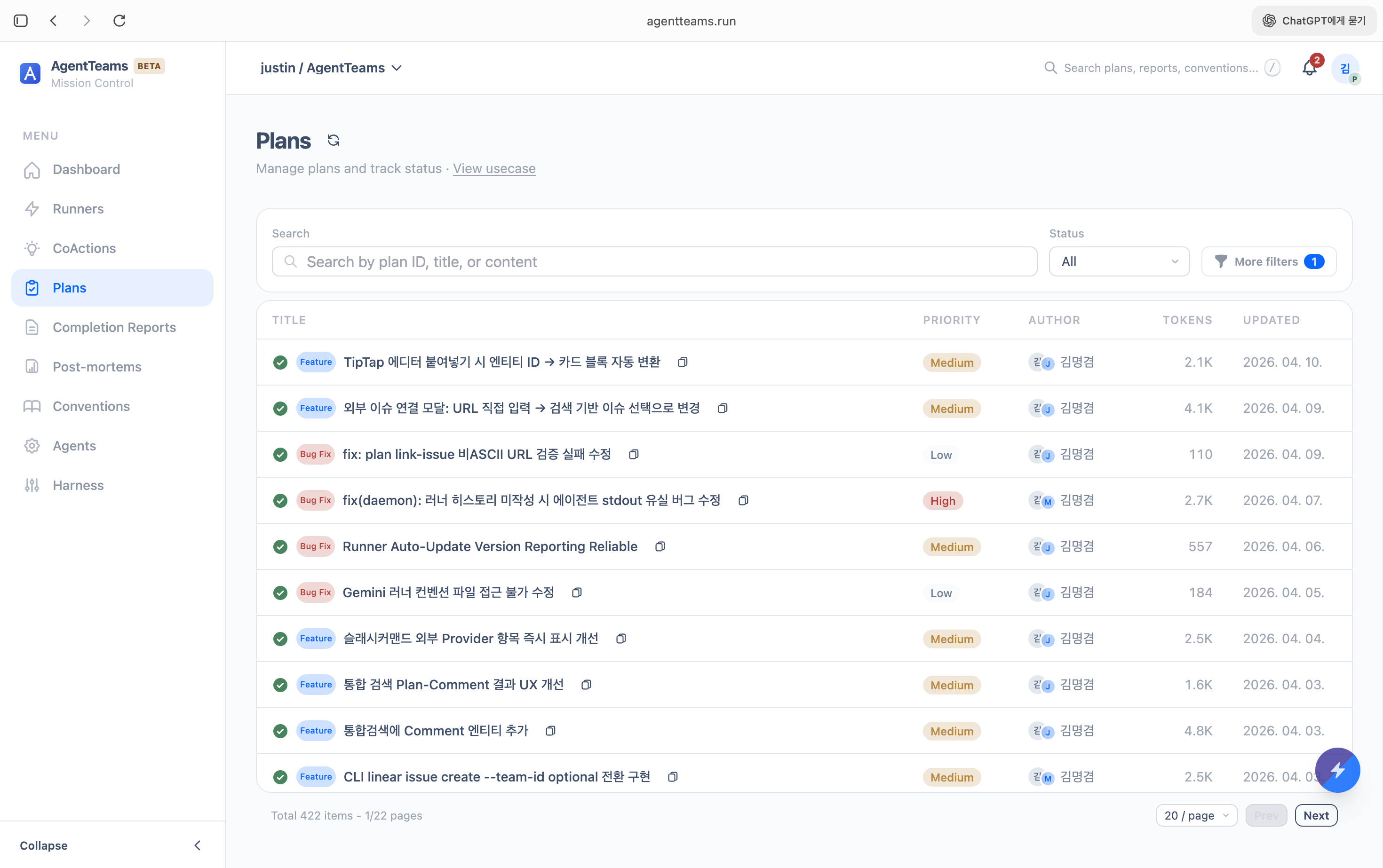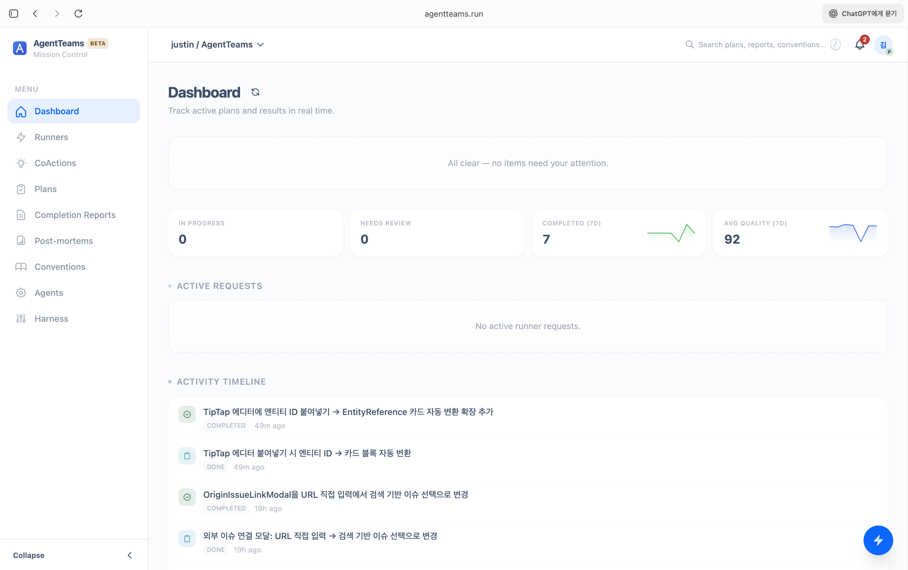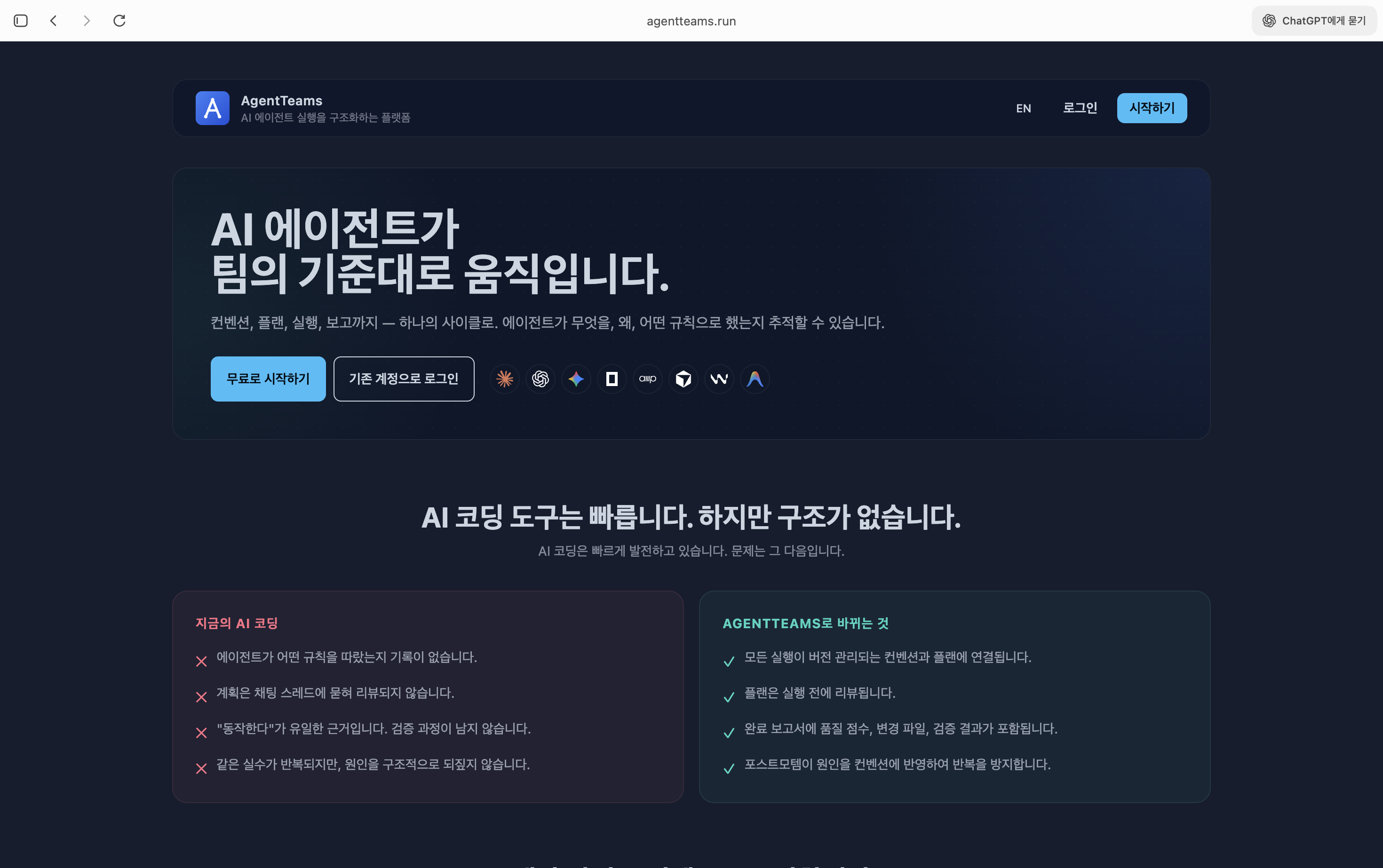 AgentTeams는 Convention(규칙) → Plan(계획) → 실행 → Report(리포트) → Post-mortem(회고)의 사이클로 AI 에이전트의 모든 실행을 팀 기준에 따라 관리합니다.