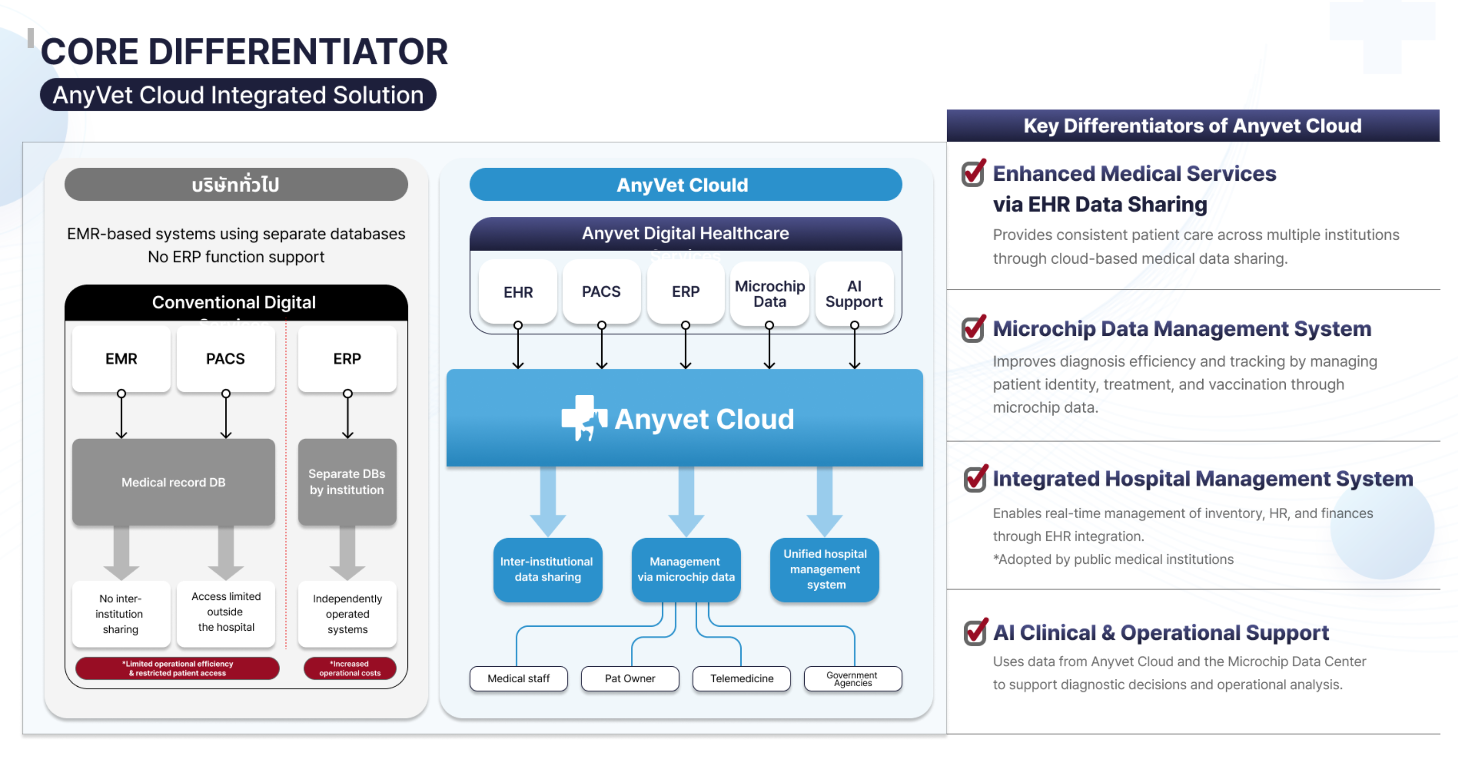 주요 제품으로는 동물병원의 AI기반 차트솔루션 AnyvetSMART (EMR&PACS), 동물 객체 관리와 데이터 시스템을 제공하는 마이크로칩 시스템과 24시간 원격진료와 다양한 서비스를 지원하는 Anyvet이 있습니다. 데이터 일원화를 통해 불필요한 검사를 줄이고, 반려동물 보호자에게 저렴하고 효율적인 서비스를 제공합니다. Anyvet은 아세안 지역에 혁신적인 동물의료 솔루션을 전파하며 시장 변화를 목표로 합니다.