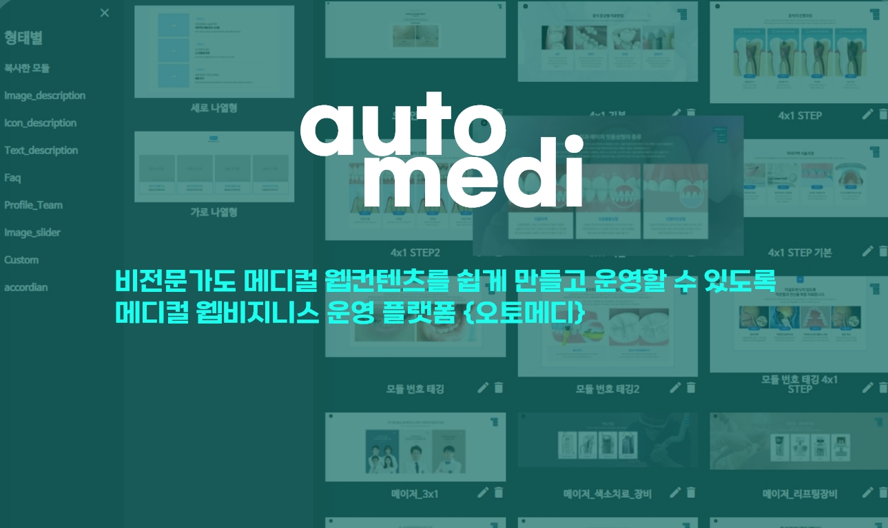 메디컬업종이 웹사이트 및 웹컨텐츠를 제작하고 운영하는데 있어 많은 비용이 들어가고 전문인력을 구하기 힘든 요즘, 비전문인력도 전문인력이 제작하는 수준의 컨텐츠 제작과 사이트,컨텐츠,예약,상담,고객관리,마케팅관리 도구 운영 및 관리까지 모두 올인원으로 할 수 있는 오토메디 서비스를 제공하고 있습니다.
