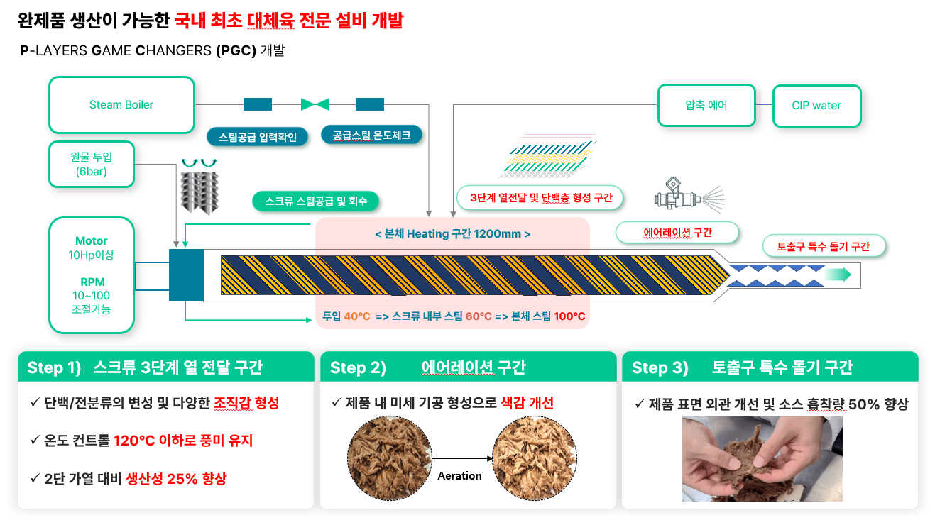 이를 해결하기 위해 저희는 그동안의 배합/설비 노하우로 대체육 전문 설비를 설계하였습니다.