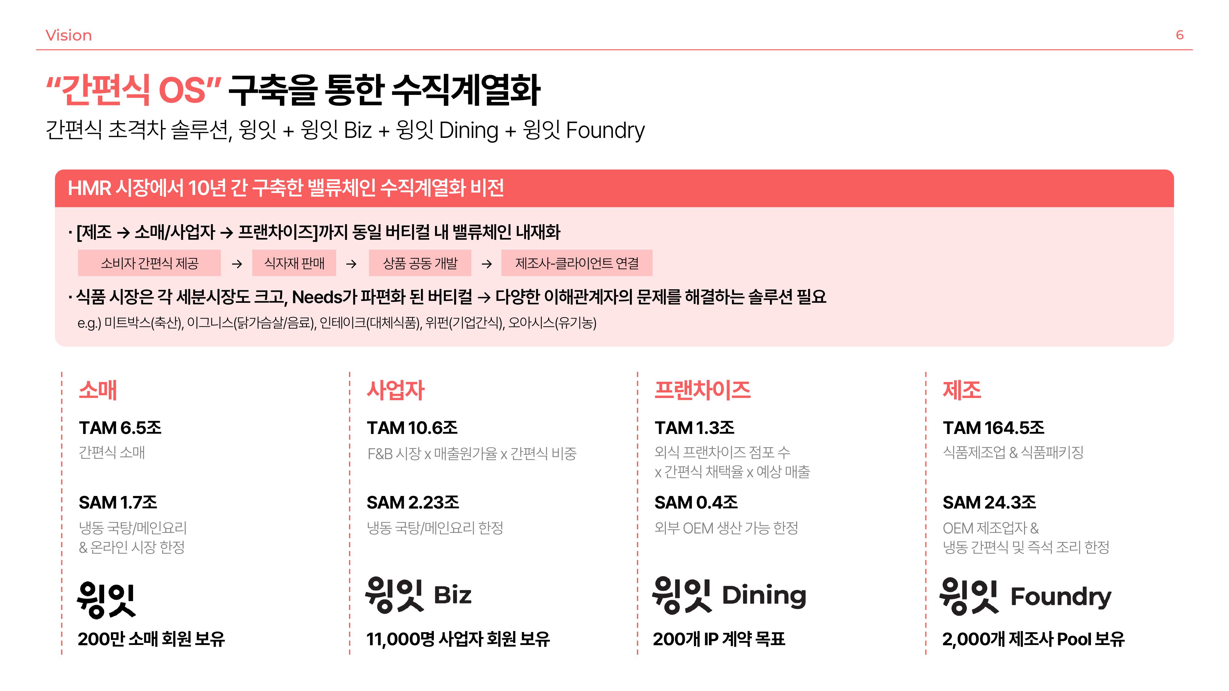 윙잇은 냉동 간편식 커머스로, 종합몰에서 취급하지 않는 독자적인 PB 상품을 기반으로 높은 로열티를 얻어 누적 매출 1,000억, 회원 200만명을 달성하였습니다. 국내 120여 곳의 OEM 파트너사와 제조하고, 물류는 3PL을 활용하고 있어 매출 신장에 따른 CAPEX가 없고 한계비용이 매우 작은 BM으로, 데이터 기반의 상품기획과 유통/마케팅 전문성을 가진 조직입니다.