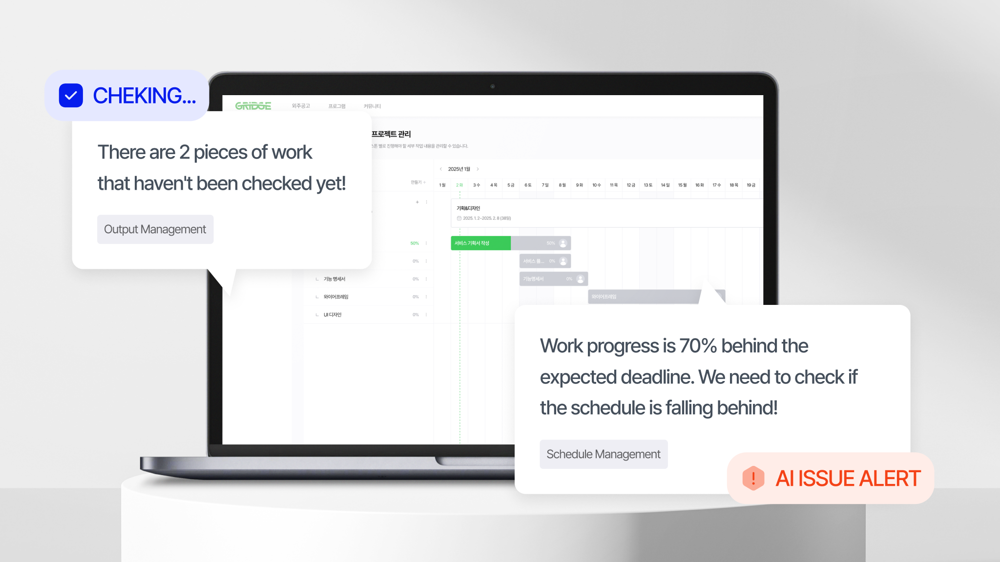 그릿지는 독자적인 '개발팀 퍼포먼스 모니터링 및 관리 SaaS'를 통해 이 70%의 비코딩 영역을 최적화하여, 기존 코딩 자동화 솔루션의 한계를 극복합니다.
