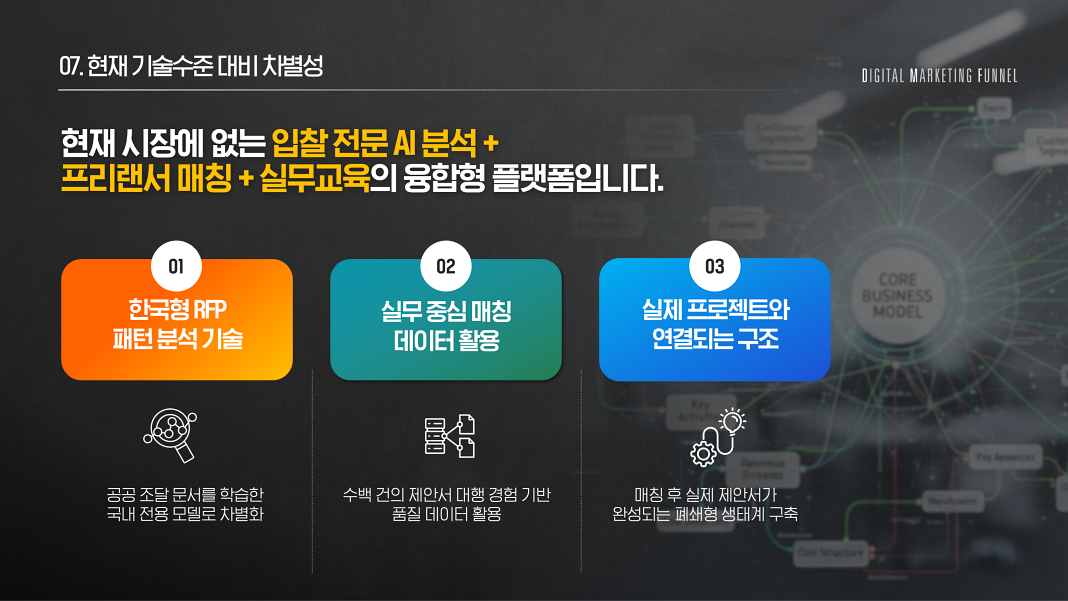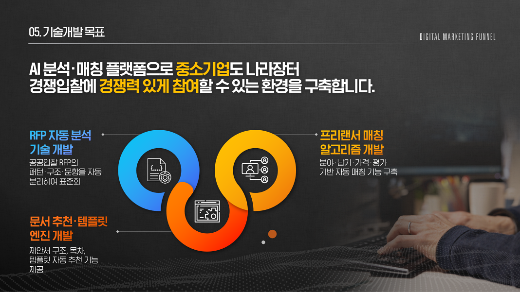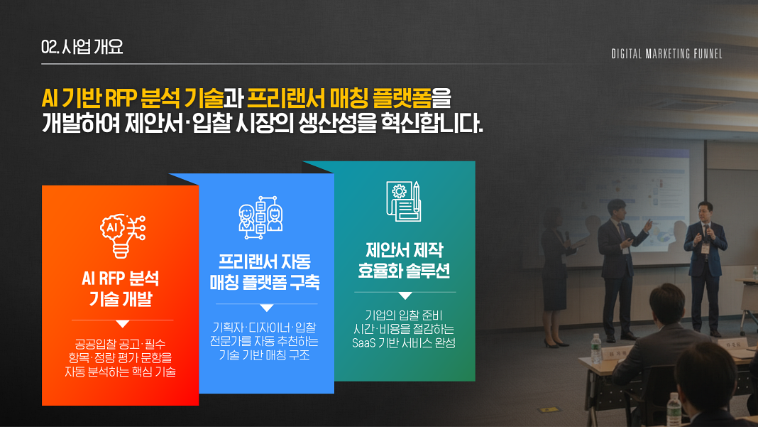 저희는 AI 기술을 기반으로 제안서, 보고서, 기획서 등 다양한 비즈니스 문서를 신속하고 전문적으로 작성하는 서비스를 제공합니다. 또한, 제안서 대행뿐만 아니라 전문 PPT 디자인 인력과 고객을 매칭해 더욱 완성도 높은 결과물을 지원합니다. AI의 논리적 흐름과 인사이트를 바탕으로 빠르게 초안을 완성하고, 이후 숙련된 인력이 최종 품질을 높이는 방식으로 고객의 시간을 절약하고 성공 확률을 높입니다. 기업, 스타트업, 프리랜서 누구나 쉽고 빠르게 고품질 문서를 제작할 수 있도록 돕는 것이 저희의 목표입니다.