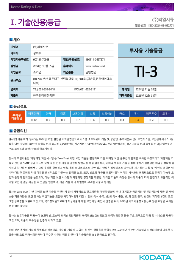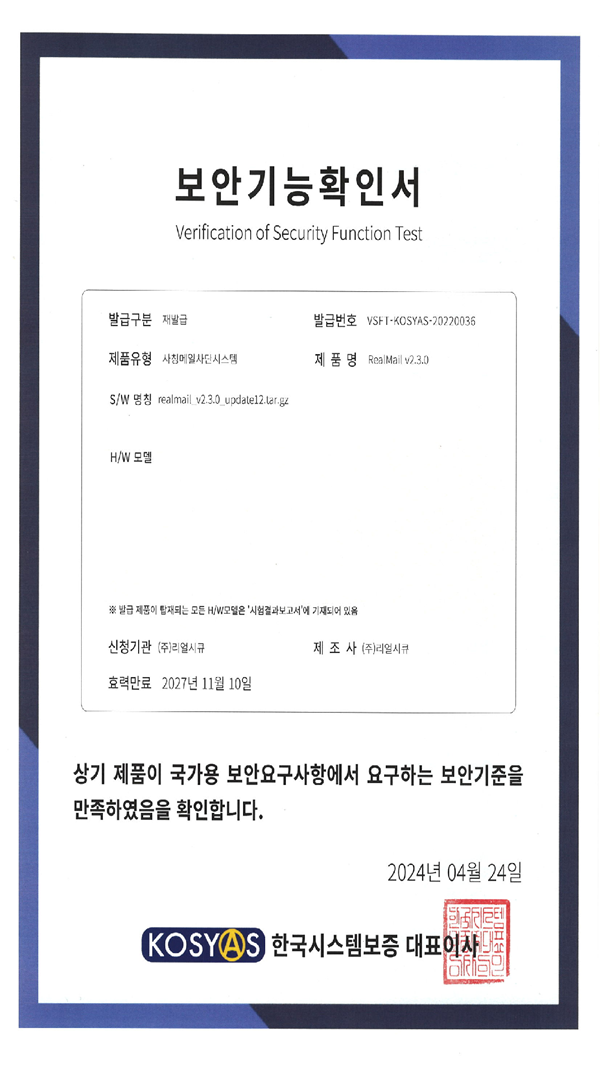 리얼시큐는 사회공학기법으로 사람을 속이는 해킹 공격을 원천 차단하는 보안소프트웨어를 개발하는 벤처기업입니다. 메일보안시스템 최초로 발신정보 검증기술을 개발하여, 국가정보원으로부터 사칭메일차단시스템으로 보안인증을 취득하였습니다. 또한, 발신정보 검증기술 특허 등록으로 특허청과 조달청으로 부터 혁신제품으로 지정되어 공공기관에 저희 "리얼메일"은 우선구매대상 이메일보안제품으로 지정되어 있습니다. 사칭메일차단시스템 "리얼메일"은 기존 메일보안시스템의 기술적인 한계를 극복한 차세대메일보안시스템입니다. 모든 메일보안시스템은 메일의 내용을 검사합니다. 메일 내용 검사는 언어기반으로 외산 제품이 국내 진입이 어려운 이유입니다.반대로 국내 메일보안시스템이 외국으로 나가는 것 또한 어렵습니다. 하지만, 리얼메일은 메일의 내용이 아닌 발신정보를 검증하는 기술이며 현재 BEC공격의 사칭메일의 피해는 국내 뿐 아닌 전세계가 똑같은 피해를 당하고 있는 것이 현실입니다.