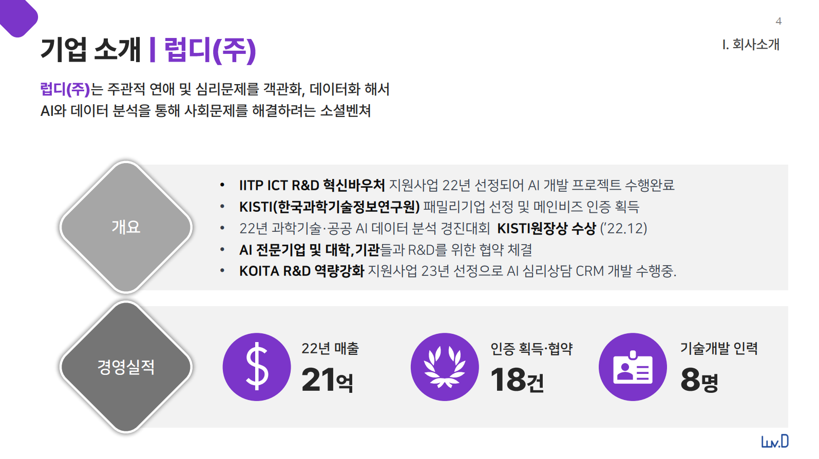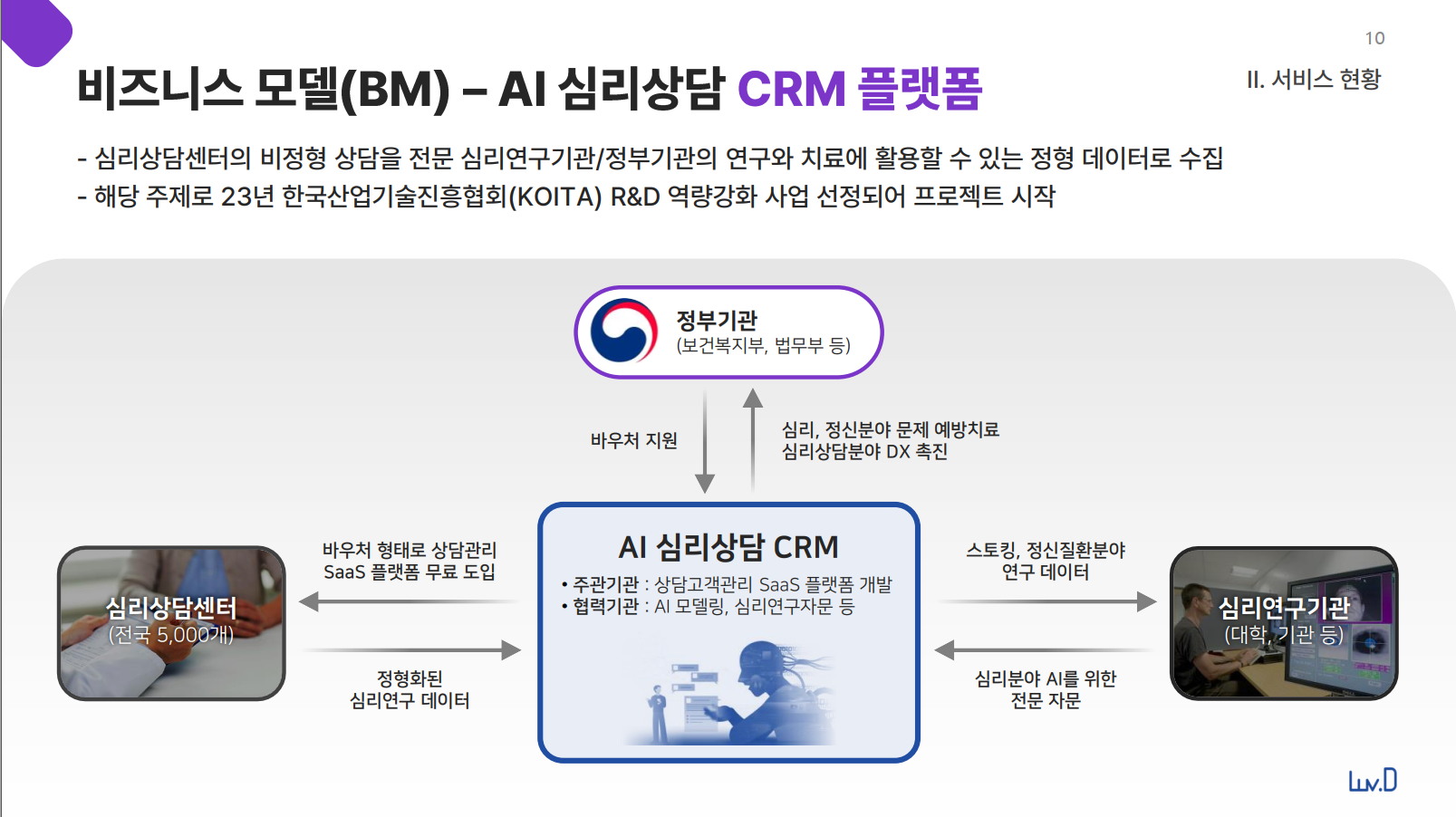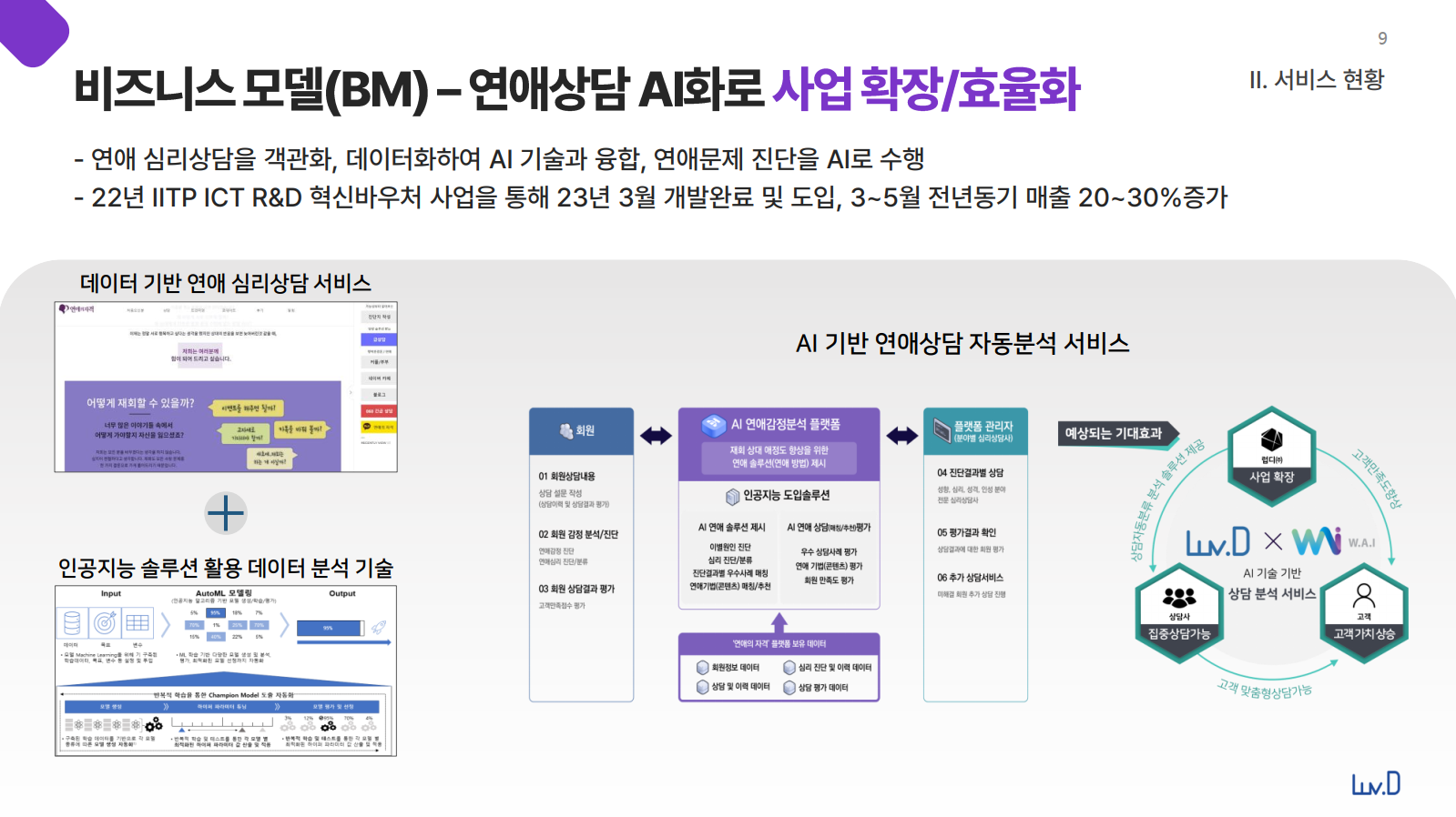 연애, 이별, 이혼 등 주관적인 문제라는 인식이 강한 '연애문제' 의 해결을 심리학적으로 객관화, 메뉴얼화 했으며, AI 및 데이터 분석을 통해 연애문제를 해결하고 컨텐츠나 상품에 대한 연애 맞춤형 추천서비스를 고객에게 제공.