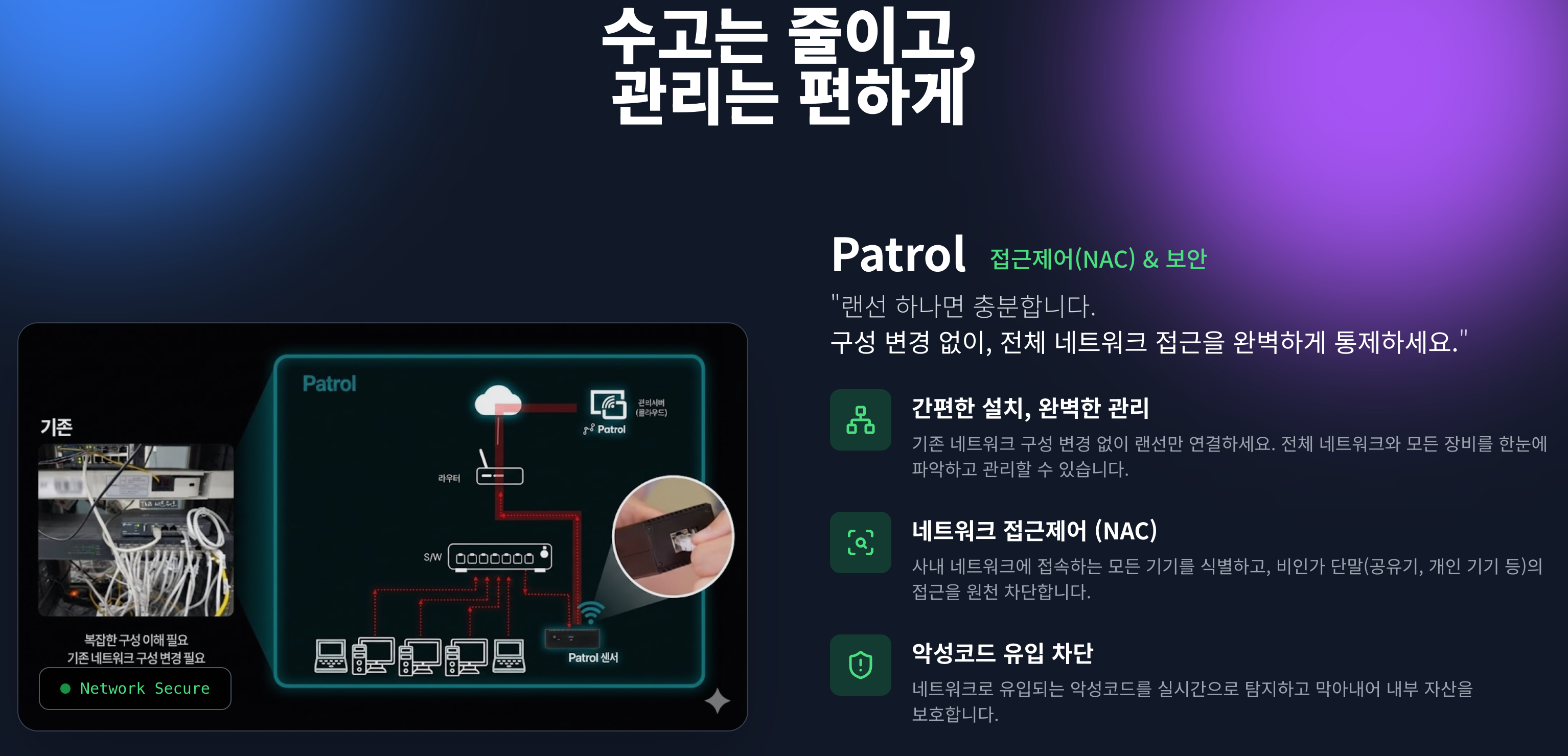 핵심 제품인 'Patrol'은 특허받은 'ARP Inline' 기술을 통해 물리적 공사나 구성 변경 없이 1분 만에 설치 가능한 '논리적 인라인' 환경을 구축합니다. 단 한 대의 장비로 접근 제어(NAC)와 위협 관리(UTM) 기능을 통합 제공하여 도입 비용을 50% 이상 절감하며, 내부망 제로트러스트 보안을 완벽히 실현합니다.