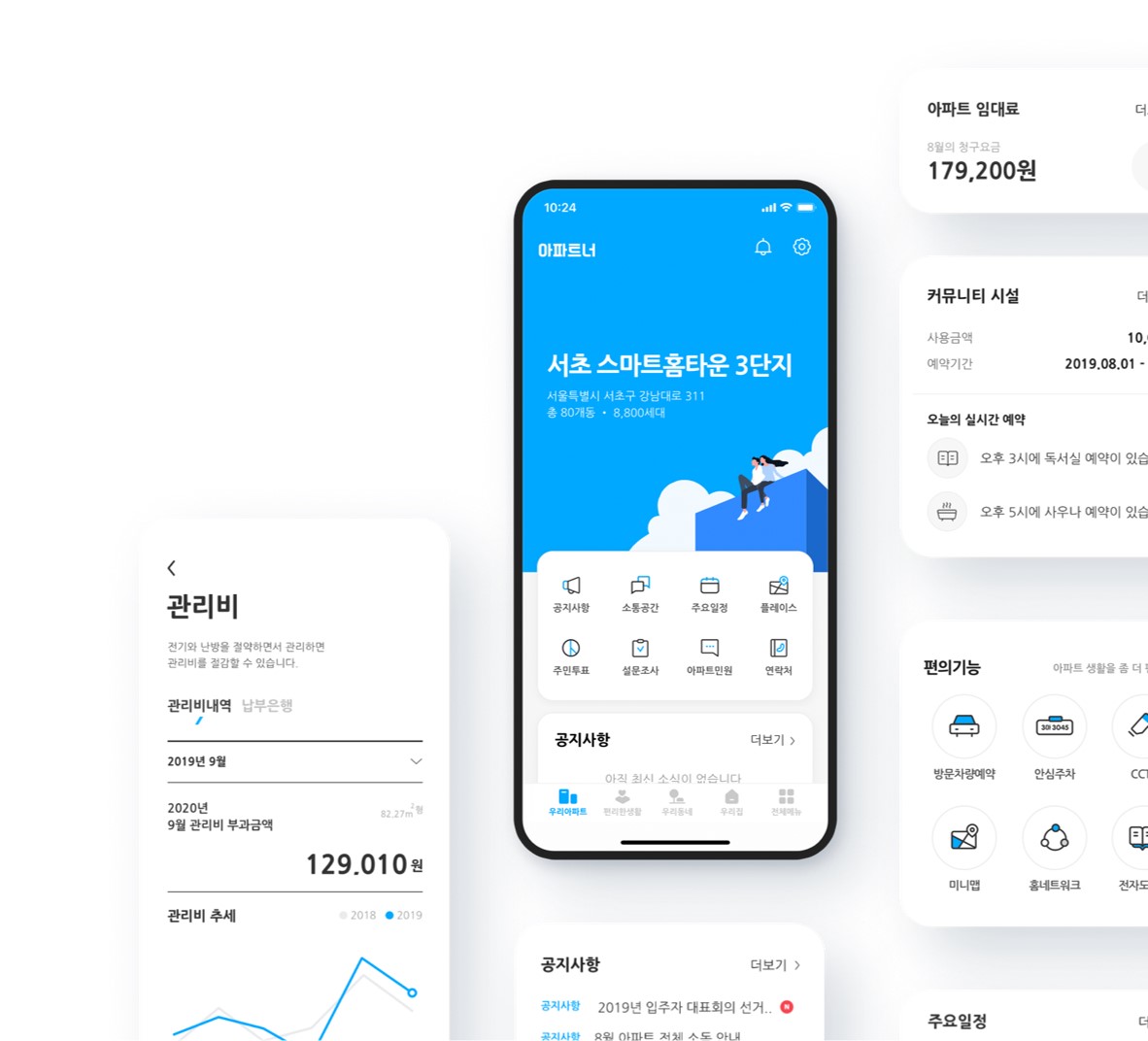 입주민 대상 주요 서비스로는, 커뮤니티 센터 예약, 전자투표, 관리비조회,하자보수 신청, 방문차량 예약 등의 기능이 있으며, 원활한 커뮤니케이션을 위한 게시판 및 중고장터 등의 소통창구를 제공하고 있습니다.