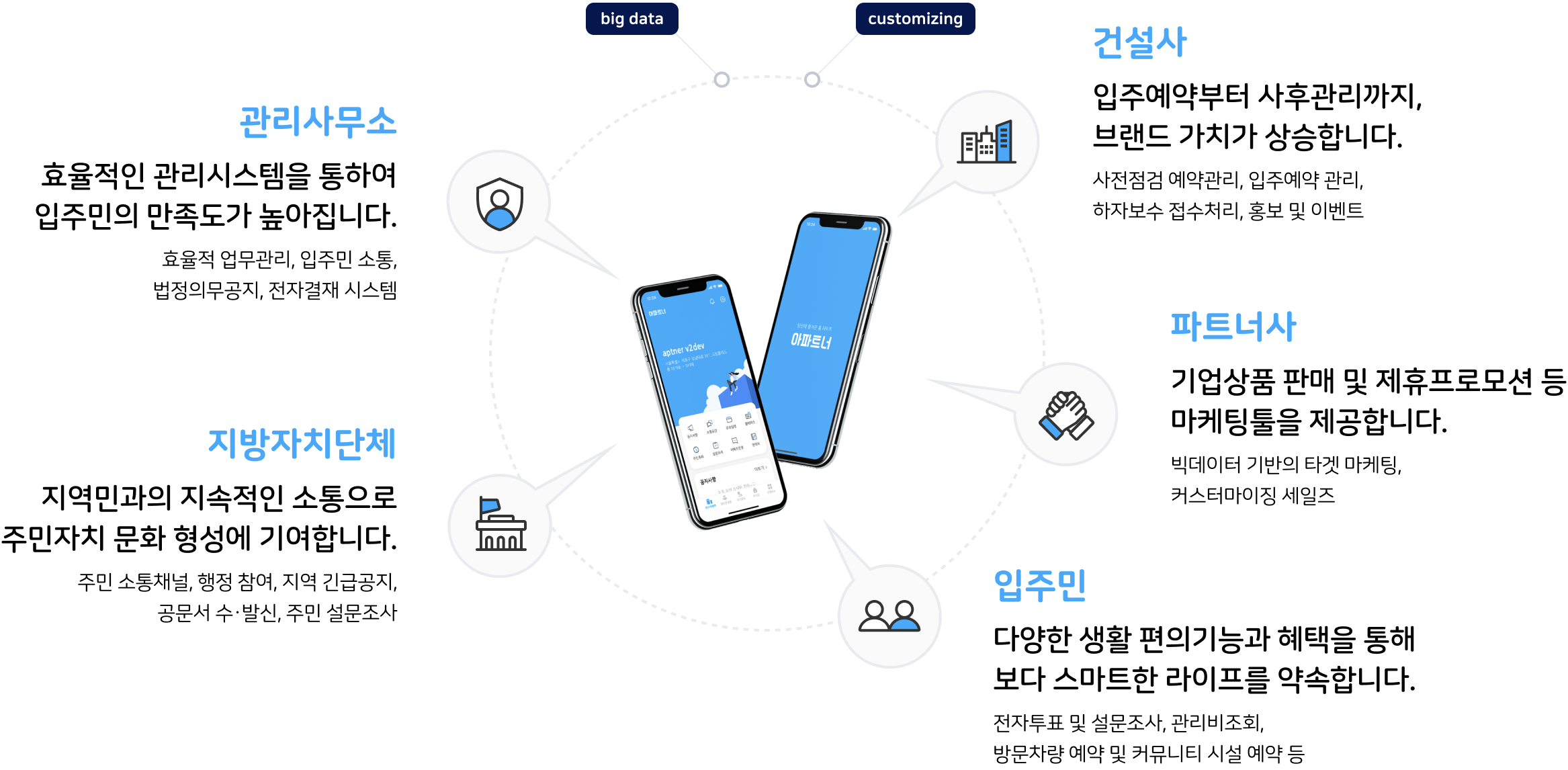 또한, 정부기관 및 지방자치단체들도 저희 아파트너 앱과의 제휴를 통해 시정홍보 및 입주민과 지자체간의 소통창구 로서 활용하고 있습니다.