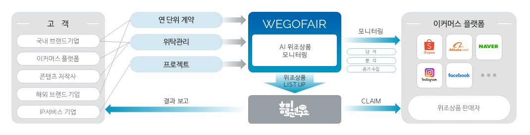 국내외 온라인마켓(쿠팡,네이버,11번가,지마켓,알리바바,타오바오,1688,라자다,쇼피,아마존,라쿠텐,큐텐 등 포함)에 대한 상품데이터를 수집하고 이들 상품들에 대한 위조상품 여부에 대한 분석을 통해 위조상품 후보군을 추출한 후 최종적으로 위조상품이라고 판단된 상품들에 대해서는 각 마켓플랫폼들에서 운영하는 신고센터를 통해 신고하여 상품의 판매를 차단하도록 도와주는 서비스임.