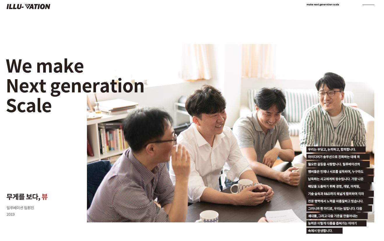 주식회사 일루베이션이 영위하는 업종에서 세계 1위를 실현함으로써 더 많은 일자리를 만들고 지속적으로 쌓아온 기술력을 기반으로 신제품, 신기술 개발에 더욱 정진하여 세계 최고 수준의 품질과 서비스를 제공함으로써 “차세대 체중 측정기를 만들다” “make next-generation scale” 는 주식회사 일루베이션의 정신을 실현해 나갈 것을 약속드립니다.