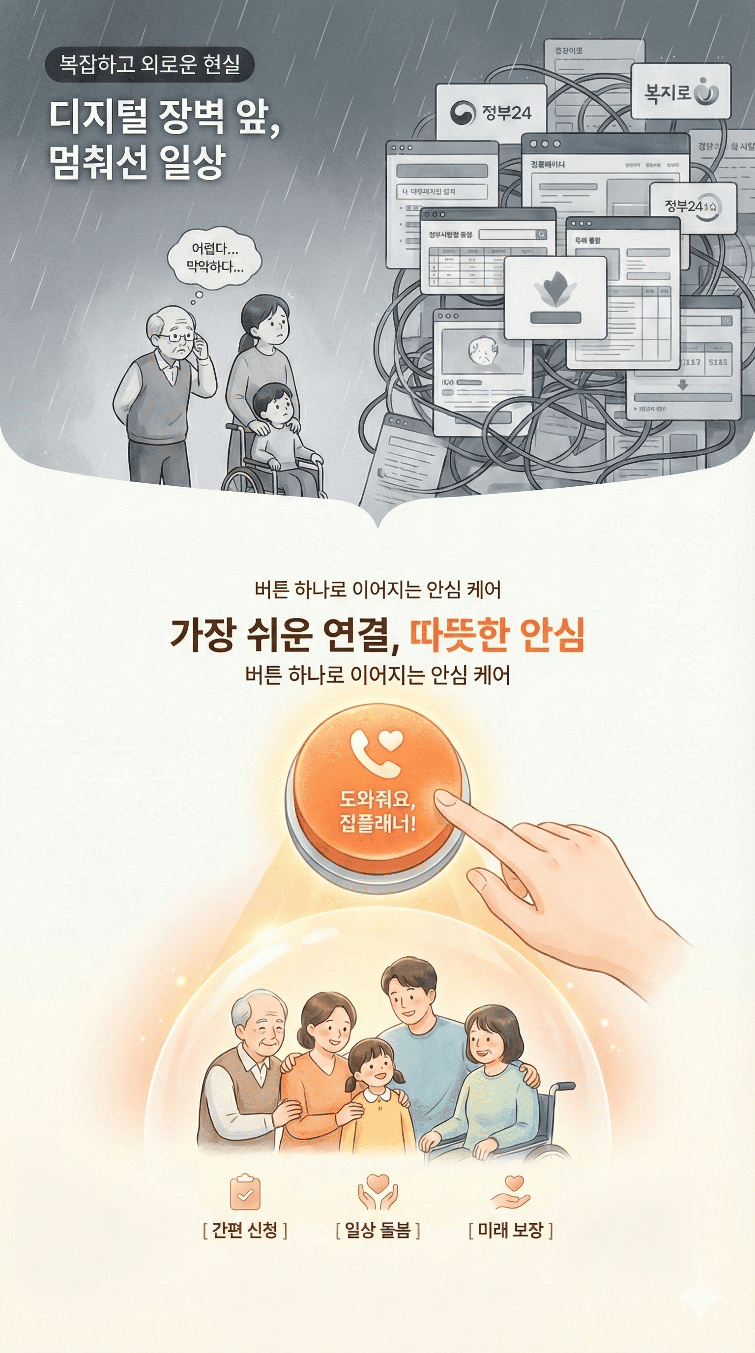 * 과거 114 전화 한 통으로 모든 문제를 해결했듯, 복잡한 인증이나 검색 없이 '버튼 하나'로 필요한 일상 서비스를 신청하는 디지털 게이트웨이입니다.