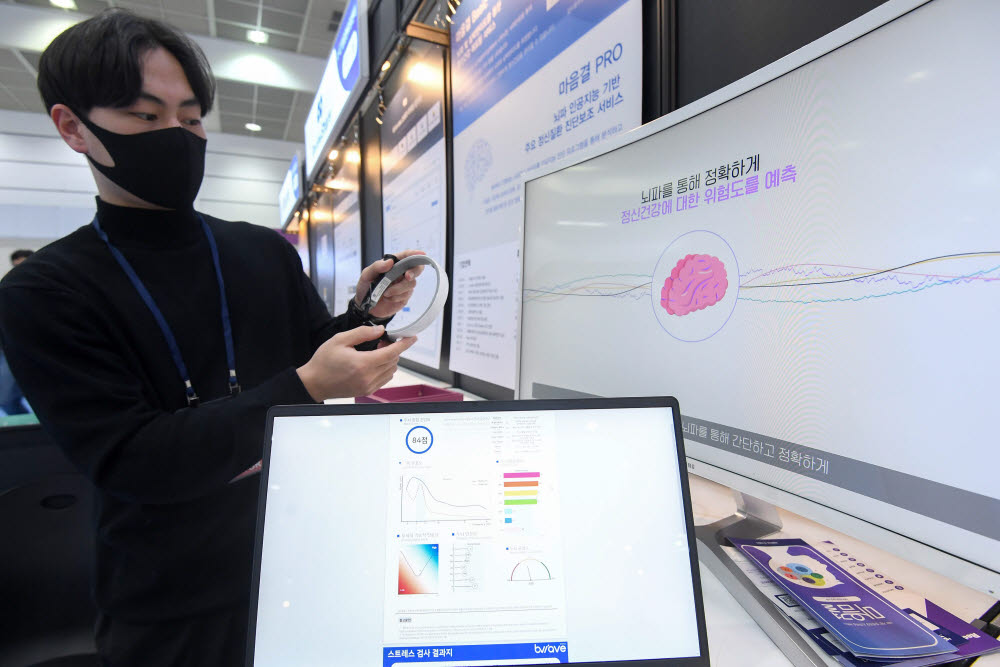디지털 전환의 핵심인 소프트웨어(SW) 산업 동향을 조망하는 국내 최대 전시인 소프트웨이브 2021이 1일부터 사흘간 일정으로 서울 강남구 코엑스에서 열렸다. 비웨이브 부스에서 개발자가 뇌파 인공지능 기반 주...