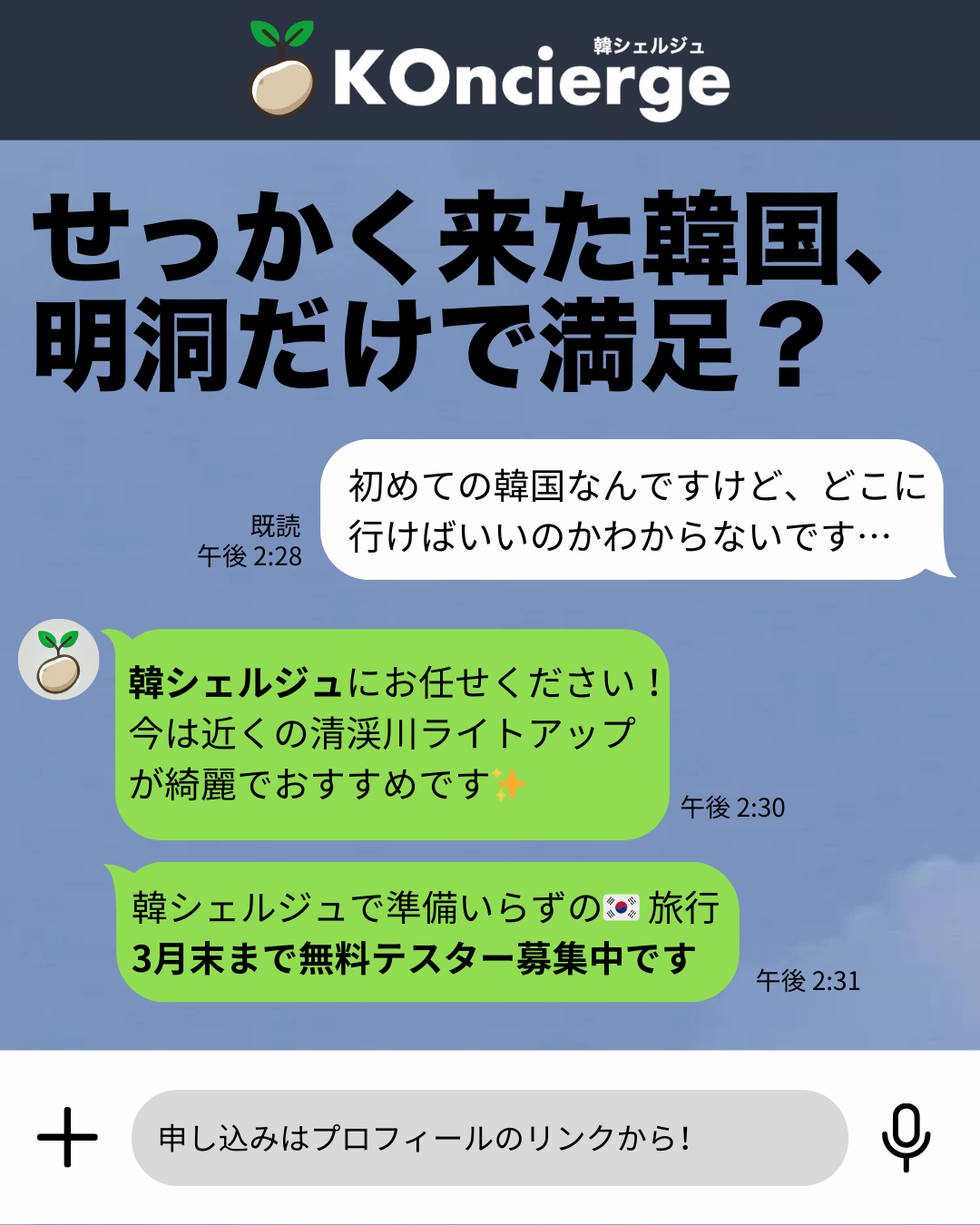 韓シェルジュ는 일본인 관광객이 LINE으로 간편하게 이용하는 한국 여행 전문 디지털 컨시어지입니다.