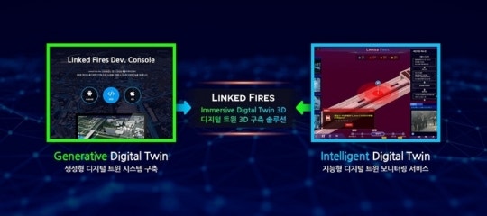 한국콘텐츠진흥원 CKL기업지원센터 입주기업인 산업형 메타버스 콘텐츠 기반 디지털 트윈 3D 솔루션 개발사 ‘테이크파이브이엔티’가 현재 개발 중인 생성형 디지털 트윈 솔루션 ‘Linked Fires’에 디지털 트윈 시