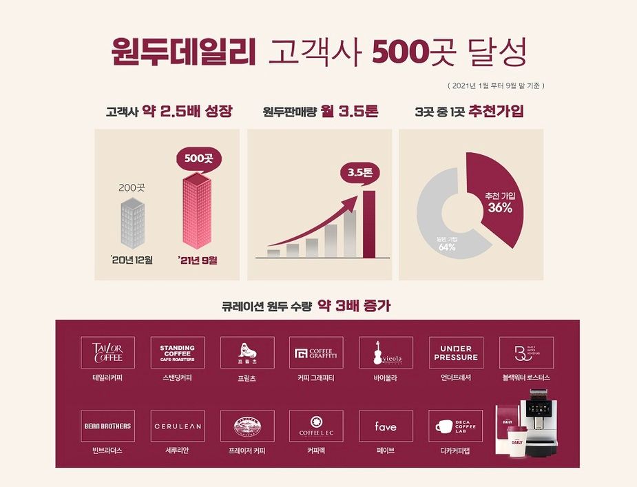 커피 유통 스타트업 스프링온워드가 운영 중인 원두 구독 및 커피머신 렌탈 서비스 원두데일리의 고객사가 500곳을 넘었다. 원두데일리 기업 구독수는 작년 말 200여곳에서 9월 말 기준 500곳으로 올 해 2배 이상 늘었다. 원두 큐레이션 주문량도 같은 기간 3배 상승했다. 원두데일리의 빠른 성장세에는 기존 서비스 이용 기업들의 추천이 많은 영향을 미쳤다. 최근 6개월(3~8월) 동안의 신규 고객사 중 추천을 통해 가입한 비중이 36%로, 작년 대비...
