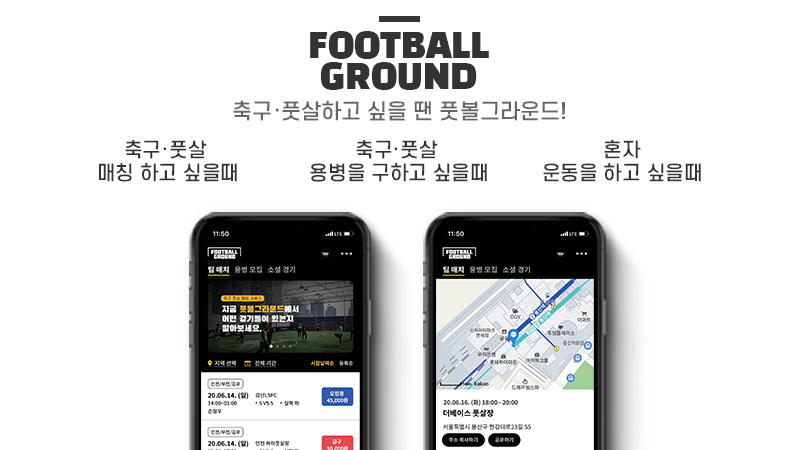 풋볼그라운드는 대한민국 No.1 스포츠 매칭 플랫폼을 목표로 남녀노소 누구나 언제 어디서든 참가비만 지불하면 축구/풋살을 즐길 수 있도록 플랫폼 솔루션을 개발하고 있으며, 매일 매일 다양한 경기장에서 경기를 진행하고 있습니다.