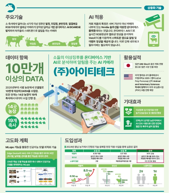 아이티테크는 빅데이터기반 AI 가축 발정, 열질병, 소의 뒤집힘등 가축 생체징후 탐지 시스템을 개발하고 있습니다.