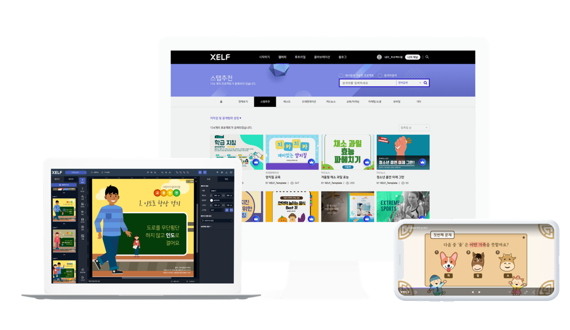 XELF는 특별한 프로그램 설치 없이 웹브라우저에서 콘텐츠 저작이 가능합니다. 간편한 웹 저작도구를 통해 프리젠테이션, 카드뉴스, 웹툰, 이러닝 콘텐츠, 케주얼 게임 등을 제작할 수 있을 뿐만 아니라 클라우드 서비스를 통해 콘텐츠의 유통, 배포, 분석까지 가능한 통합관리환경을 제공합니다.