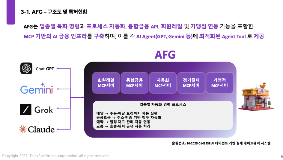 자체 개발한 AFG(AI Financial Gateway) 를 통해 GPT·Gemini·Clova 등 다양한 AI Agent가 요금조회·인증·결제를 자동으로 처리할 수 있게 하며, 학원·배달·공공요금 등 생활형 가맹점의 자동결제와 정산을 통합 지원합니다.
