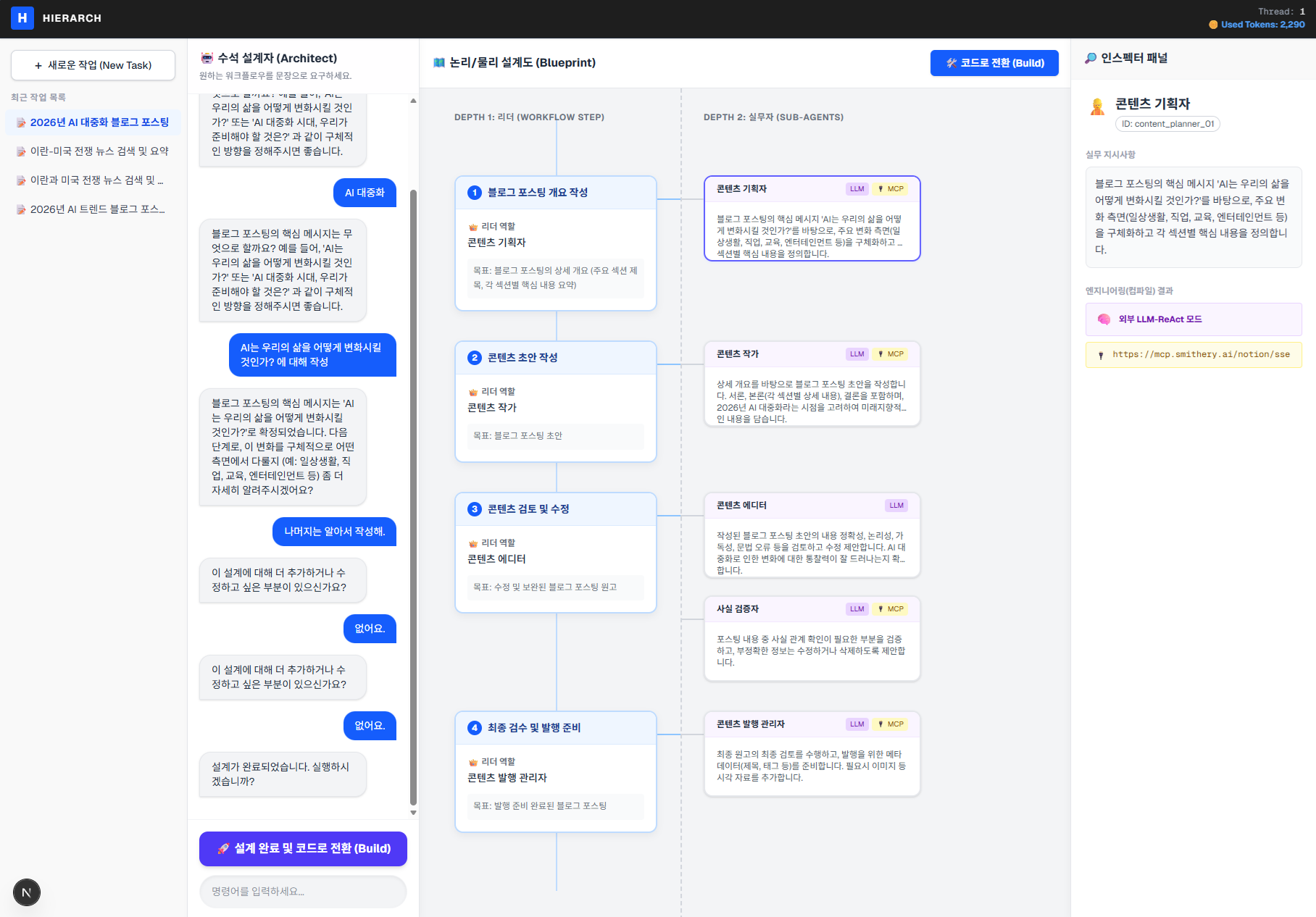 - 설계 자동화: 자연어 인터뷰만으로 완결된 에이전트 워크플로우(Blueprint) 자동 생성