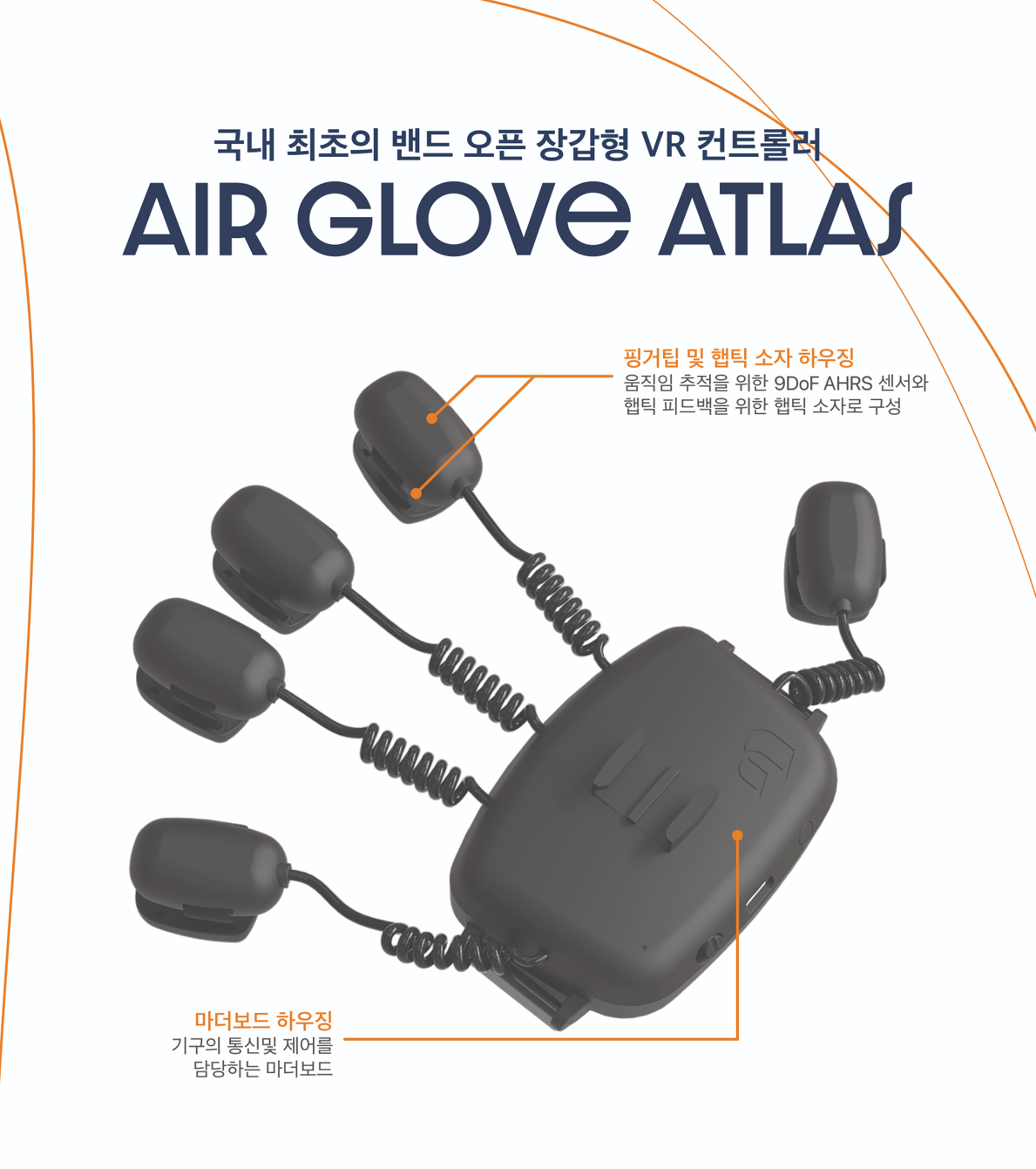 왓츠랩 자체 개발 "Air Glove Atlas"는 손에 착용하여 현실에서의 동작을 직접 매핑하여 가상환경에 입력할 수 있으며, 가상환경에서 생성되는 피드백 정보를 현실의 유저에게 전달할 수 있습니다.