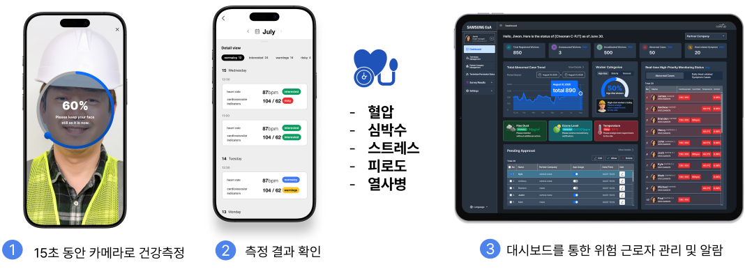 본 플랫폼은 이러한 문제를 해결하기 위해, 근로자가 출근 전 자신의 휴대폰 카메라만으로 간편하게 건강 상태를 점검할 수 있도록 설계되었습니다. 측정 결과에서 이상 징후가 감지될 경우, 안전·보건 담당자가 즉시 확인하고 필요한 조치를 취할 수 있는 관리 체계를 제공합니다.