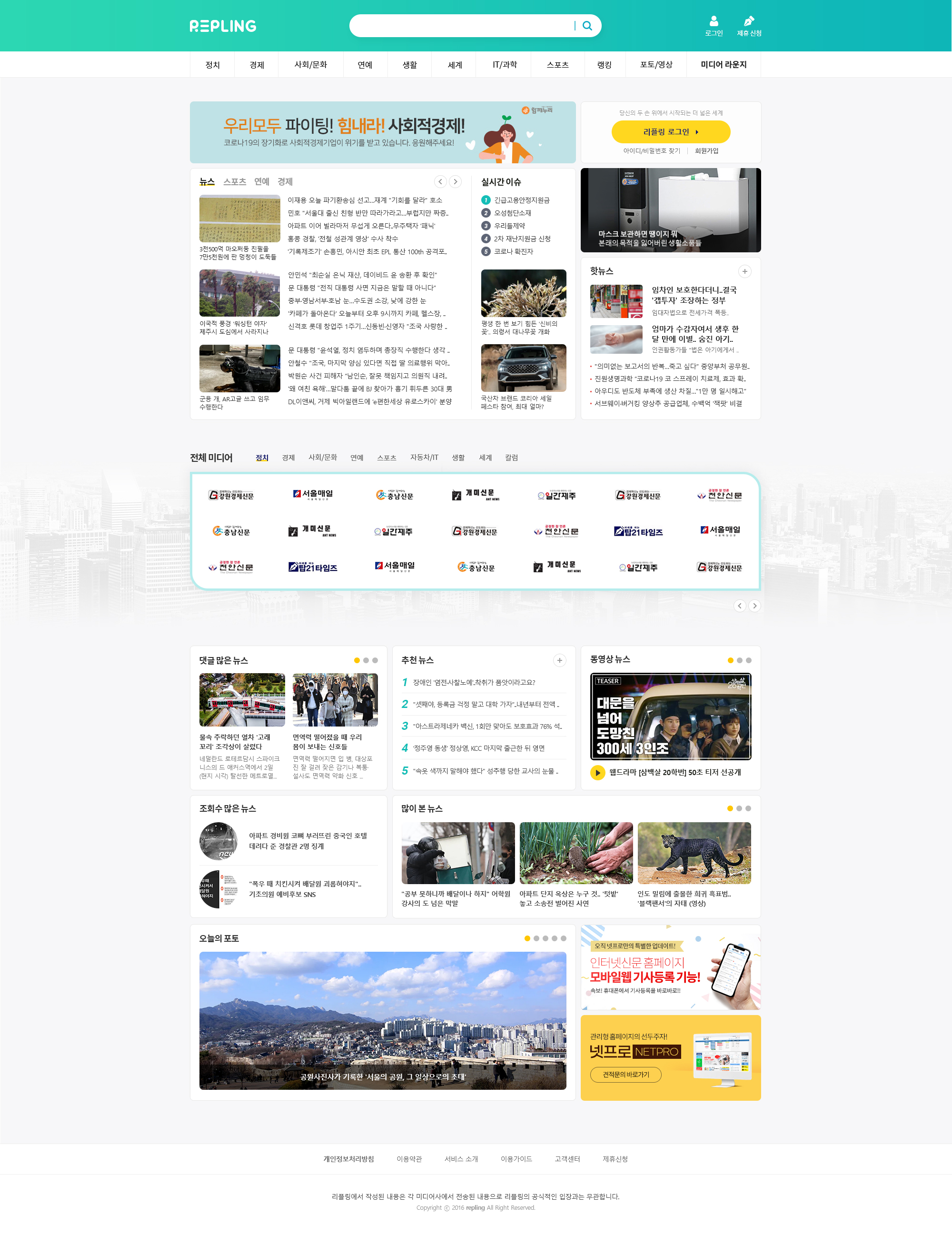 리플링은 넷프로 인터넷신문 제휴 파트너 분들의 기사를 모아서 볼 수 있는 뉴스 포털 사이트로,