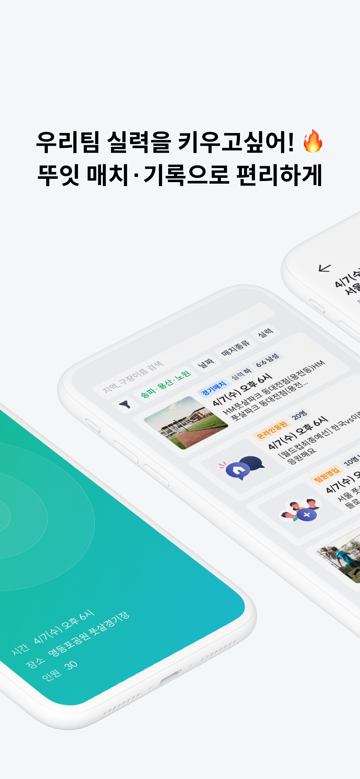 매치 뿐 아니라 팀을 관리, 커뮤니티, 이력관리까지 목적에 따라 이앱 저앱 옮겨다닐 필요 없이 한손으로 간편하게 스포츠를 즐길 수 있게 됩니다.