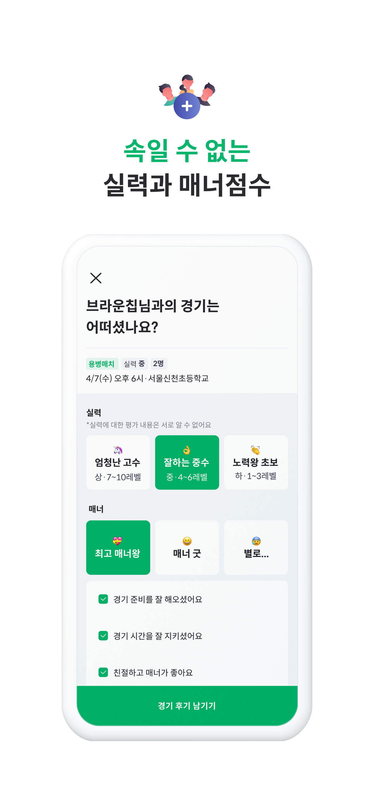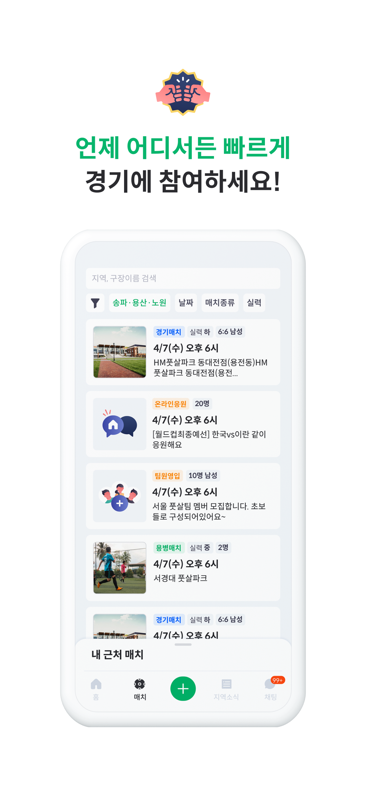 상대를 찾고 경기를 뛰기까지 모든 프로세스를 하나의 앱으로 해결할 수 있습니다.