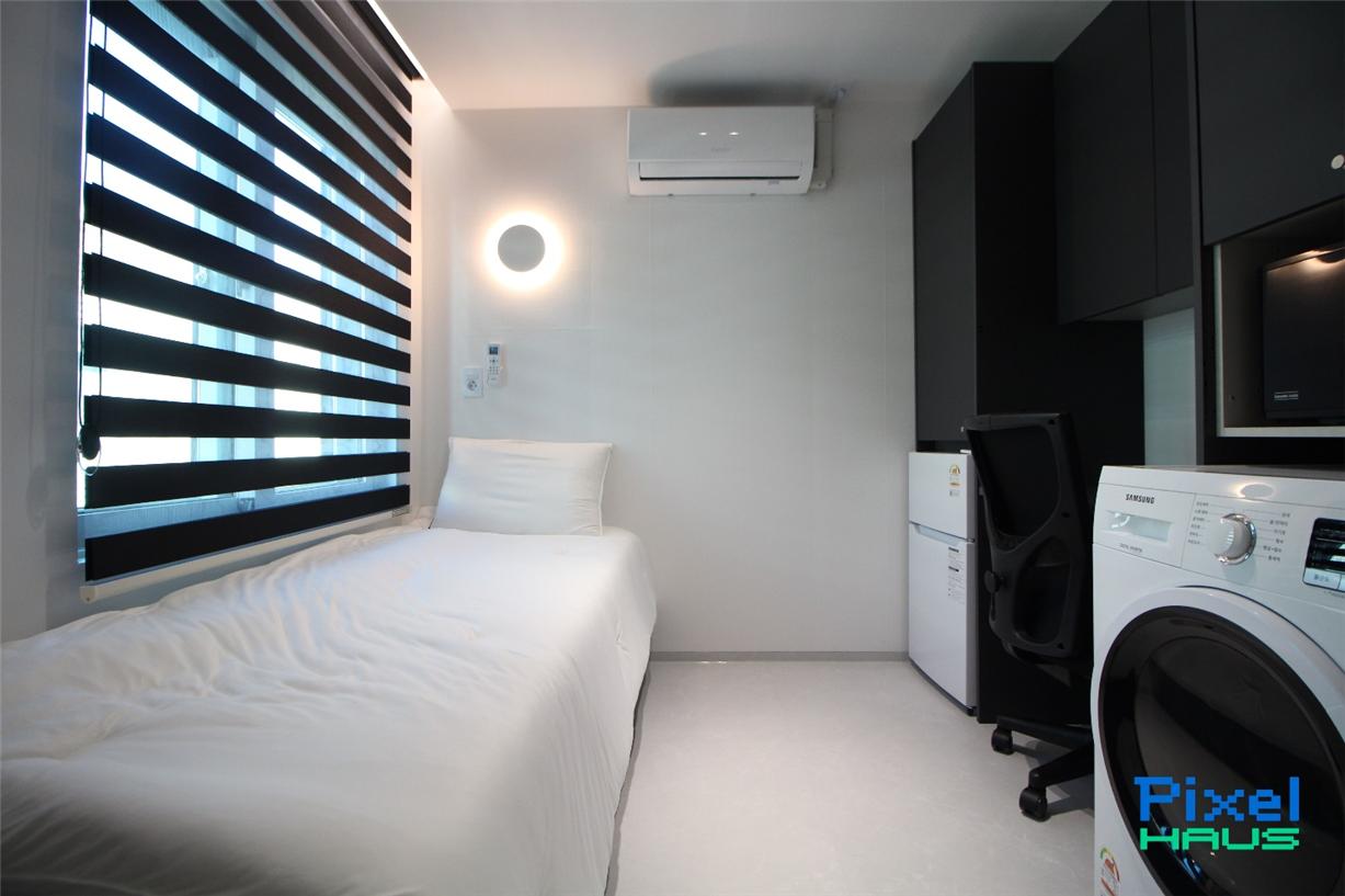 로카101이 운영하는 도심형 기숙사 프랜차이즈 ‘픽셀하우스’는 기존 오피스텔 대비 보증금은 50배가 낮고, 월세는 공과금, 관리비가 포함되어 있다. 방학, 이직 등 주거 변수가 많은 청년 1인 가구들에게 맞춰 계약 기간은 1개월부터 가능하다. 개인 공간은 풀옵션으로, 상대적으로 사용 빈도가 낮은 세탁실과 주방은 공유하는 코리빙 방식을 통해 1인 가구에게 최적의 공간을 제공한다.