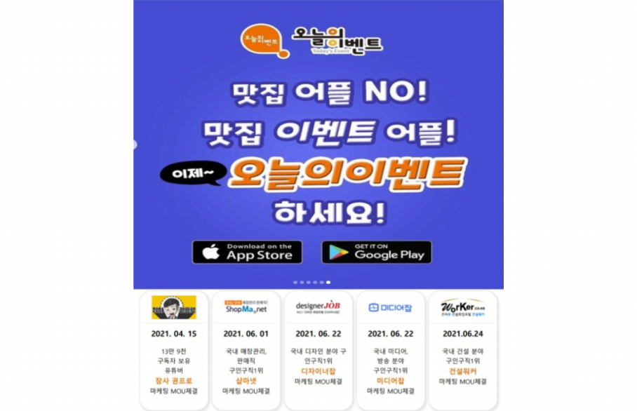 또한 어플 이용 주타켓인 직장인이 많이 이용하는 전문취업플랫폼 매장관리, 판매직 1위 취업플랫폼 ‘샵마넷’ , 건설분야 1위 취업플랫폼 ‘건설워커’, 국내 미디어, 방송분야 1위 취업플랫폼 ‘미디어잡’, 디자인분야 1위 취업플랫폼 ‘디자이너잡’과 협력을 통해 오늘의이벤트 어플 노출을 통해 외식을 즐기고, 트렌드에 민감한 취업준비생 및 직장인 사용자를 확보해 나갈 것이며 동시에 다양한 외식 관련 기업들과의 지속적인 제휴와 협력을 이어갈 것이라 밝혔다.