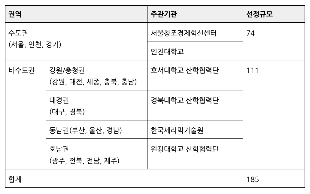 경북대학교 산학협력단 | 코스닥 상장 및 아기유니콘 배출 등 우수 기업 육성 사례가 풍부합니다. 재창업 전용 투자재원 마련 및 기술금융 전문기관과의 컨소시엄을 통한 융자 연계가 강점입니다. | 스케일업 가시화 단계의 ICT 및 스마트 제조 기업 |