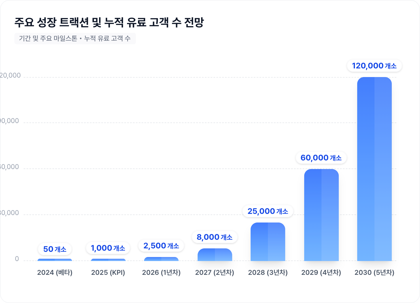 MVP 테스트를 통해 확보된 지표와 미래의 달성 시나리오를 데이터 기반 차트로 생성하여 사업의 폭발적 성장을 증명합니다.