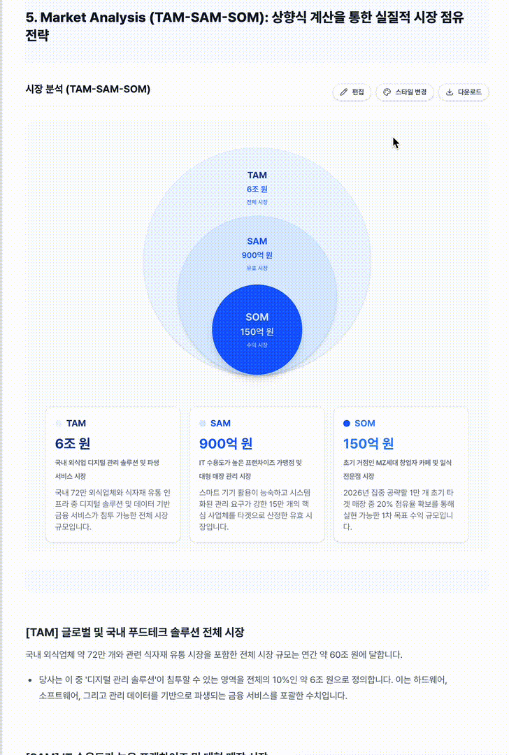 상위 3% 수준의 사업계획서를 위해 메이크덱은 창업자가 보유한 MVP 데이터를 활용해 다음과 같은 고도화된 결과물을 추가로 작성합니다. 그리고 모든 차트는 레이아웃과 컬러, 내용을 커스터마이징 할 수 있습니다.