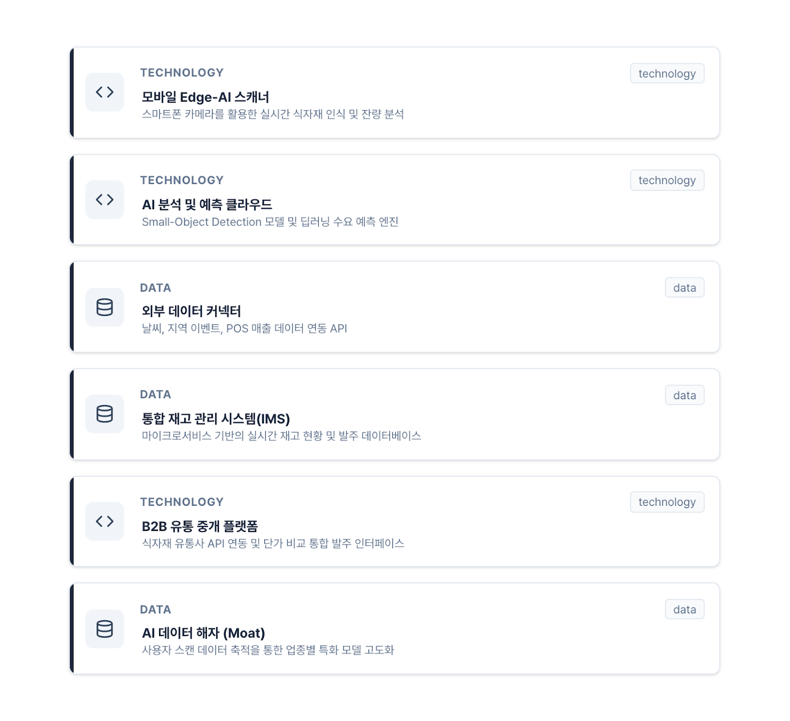 [파괴적 차별화: 시간 95% 단축 및 비용 32% 절감] 당사는 소상공인의 스마트폰 카메라만으로 재고를 자동 스캔하는 저비용 구조를 채택하여 경쟁사의 고가 하드웨어 방식의 한계를 파괴적으로 개선했습니다. 이를 통해 기존 매일 120분이 소요되던 수동 재고 관리 시간을 5분 이내로 95% 단축시켰으며, AI 정밀 예측을 통해 식자재 폐기 비용을 전년 대비 32% 절감하는 실질적 경제 가치를 증명했습니다.