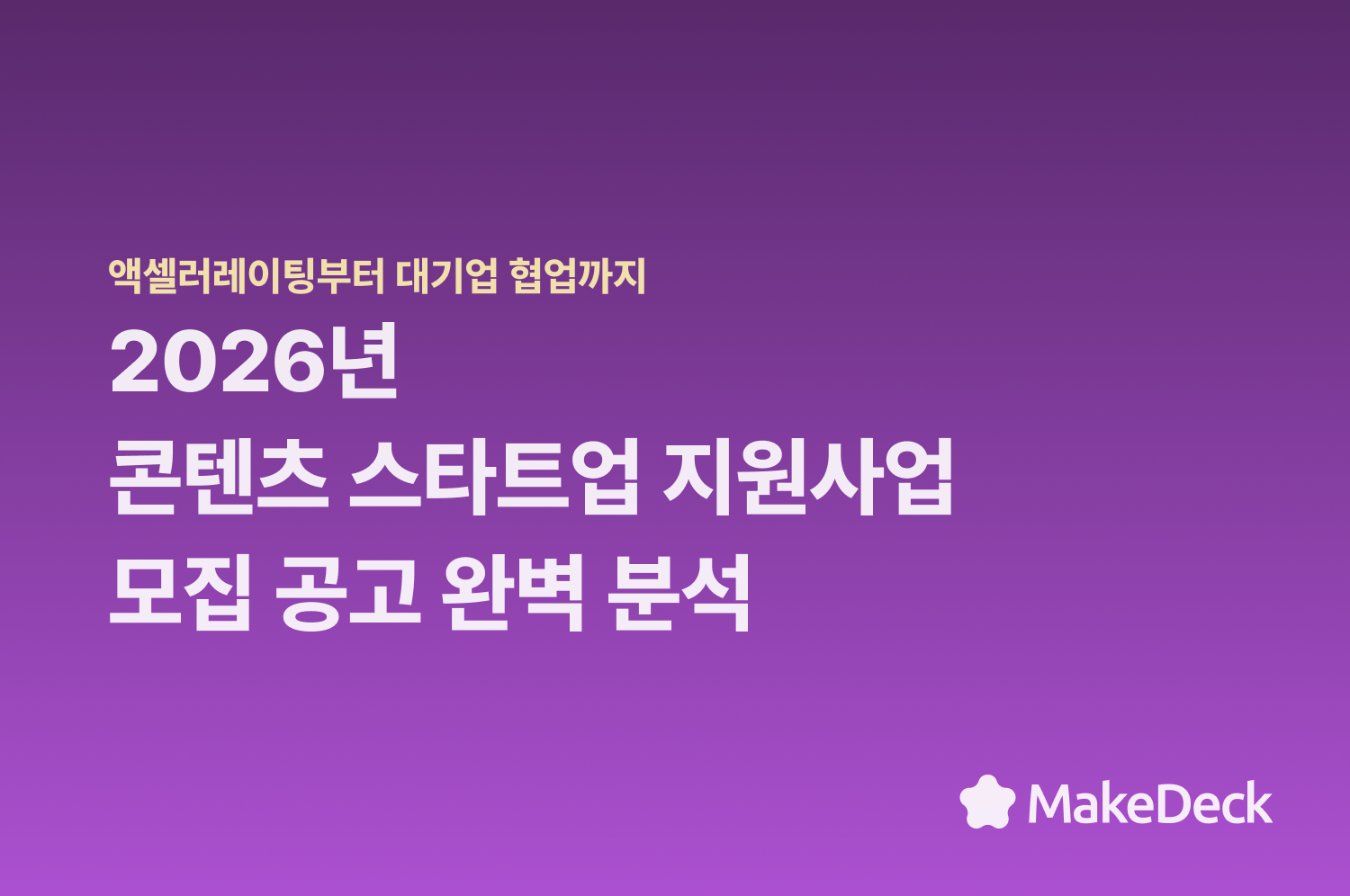 메이크덱(MakeDeck)은 250여 개 정부지원사업을 기획하고 심사해온 전문가들의 노하우를 AI 알고리즘에 담았습니다. 우리 기업의 아이템만 입력하면, 심사위원을 단번에 설득할 수 있는 상위 3% 수준의 압도적인 사업계획서를 단 10분 만에 완성해 드립니다. 지금 바로 메이크덱과 함께 2026년 콘텐츠 스타트업 지원사업 합격의 주인공이 되어보세요!