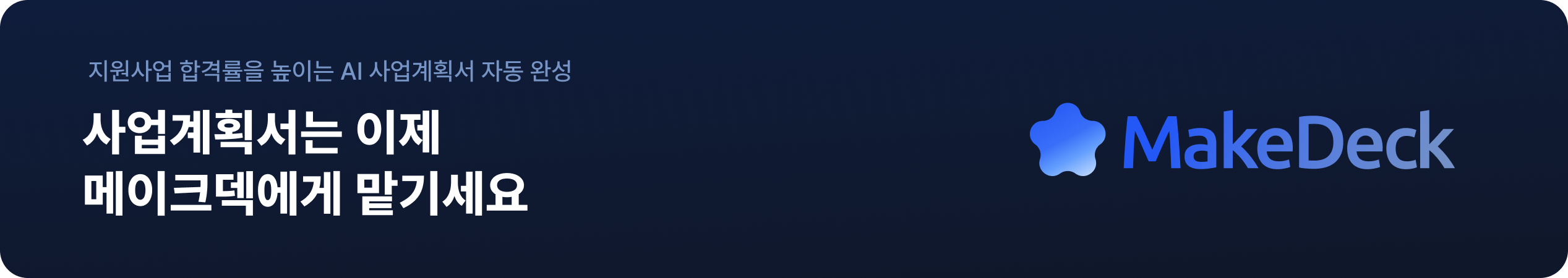 안녕하세요! 정부지원사업 합격을 위한 사업계획서 작성 1등 AI 솔루션,메이크덱(MakeDeck)입니다.